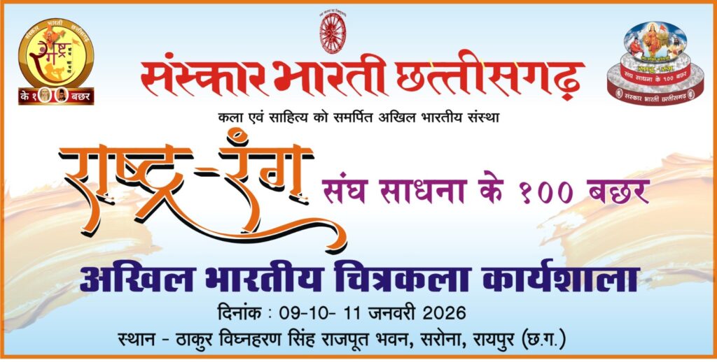 रायपुर। राष्ट्रीय स्वयंसेवक संघ के शताब्दी वर्ष के पावन अवसर पर संस्कार भारती छत्तीसगढ़ एक ऐतिहासिक और सृजनात्मक पहल करने जा रही है। आगामी 9, 10 एवं 11 जनवरी 2026 को “राष्ट्र रंग – संघ साधना के 100 वर्ष” विषय पर अखिल भारतीय चित्रकला कार्यशाला का आयोजन रायपुर में किया जाएगा। यह आयोजन केवल कला का मंच नहीं, बल्कि संघ की सौ वर्षों की साधना, सेवा, विचार और राष्ट्र निर्माण की यात्रा को दृश्य माध्यमों में अभिव्यक्त करने का सशक्त प्रयास होगा।