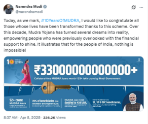 प्रधानमंत्री नरेंद्र मोदी ने मुद्रा (MUDRA) योजना के तहत दिए गए ऋणों की सफलता पर प्रकाश डालते हुए कहा कि इस योजना के तहत अब तक 33 लाख करोड़ रुपये का गारंटी-मुक्त ऋण वितरित किया जा चुका है. जिससे 52 करोड़ से अधिक लोगों को लाभ हुआ है.
