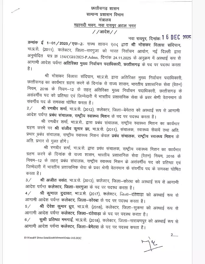 रायपुर। राज्य सरकार ने प्रशासनिक फेरबदल करते हुए 11 भारतीय प्रशासनिक सेवा के अधिकारियों का तबादला किया है। इसके साथ ही कई जिलों के कलेक्टरों को भी बदला गया है। सरकार के इस निर्णय से प्रदेश के प्रशासनिक ढांचे में महत्वपूर्ण बदलाव देखने को मिलेंगे।