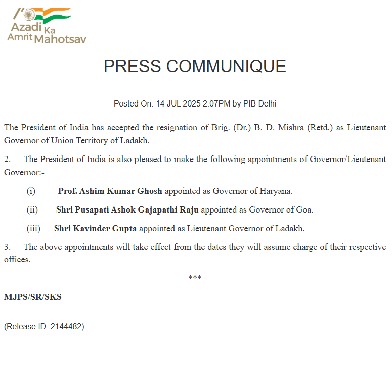 नई दिल्ली: राष्ट्रपति द्रौपदी मुर्मु ने सोमवार को देश के दो राज्यों और एक केंद्र शासित प्रदेश में नए राज्यपाल व उपराज्यपाल की नियुक्ति की। राष्ट्रपति भवन द्वारा जारी अधिसूचना के अनुसार हरियाणा व गोवा के राज्यपाल बदल दिए गए हैं, जबकि लद्दाख में नए उपराज्यपाल की नियुक्ति हुई है।