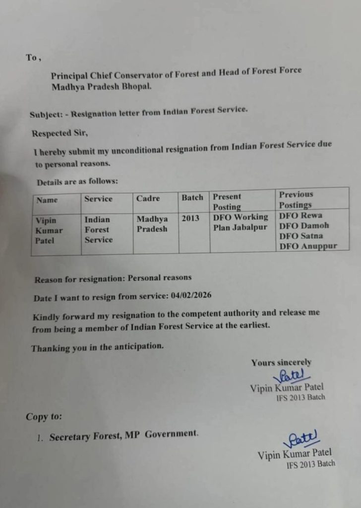 भोपाल | मध्यप्रदेश प्रशासनिक हलकों से इस वक्त की बड़ी खबर सामने आई है। भारतीय वन सेवा (IFS) के वरिष्ठ अधिकारी विपिन पटेल ने अपने पद से इस्तीफा दे दिया है। वे 2013 बैच के IFS अधिकारी हैं और फिलहाल जबलपुर प्लानिंग में वन मंडलाधिकारी (DFO) के पद पर पदस्थ थे।