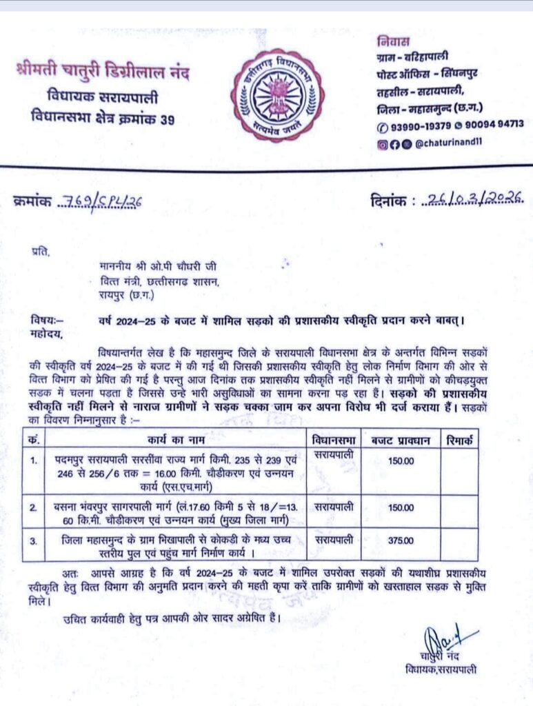 आरोप प्रत्यारोप का दौर व श्रेय लेने की होड़ ।कुछ इसी तरह का प्रकरण फिर आज सामने आया है। जिसमें सरायपाली से सरसीवां मार्ग हेतु लगभग 24 करोड़ 48 लाख 33 हजार रुपए की स्वीकृति को अपनी सफलता दिखाने सोशल मीडिया में ट्रोल हो रहा है । कांग्रेस विधायक चातुरी नन्द द्वारा जारी पत्र में बताया गया है कि इस मार्ग के 235 से 239 तथा 246 से 256/6 तक कुल 16 किलोमीटर मार्ग के चौड़ीकरण व उन्नयन किए जाने हेतु वित्त मंत्री ओपी चौधरी को पत्र क्रमांक 769/SPL/2025-2056 दिनांक 26/3/2026 को पत्र लिखकर 2024-25 के बजट में शामिल सड़क की प्रशासकीय स्वीकृति हेतु लोक निर्माण विभाग द्वारा वित्त विभाग को प्रेषित किया गया था किंतु अभी तक स्वीकृत नहीं किया गया जिसके कारण अनेकों बार आंदोलन भी किया गया था