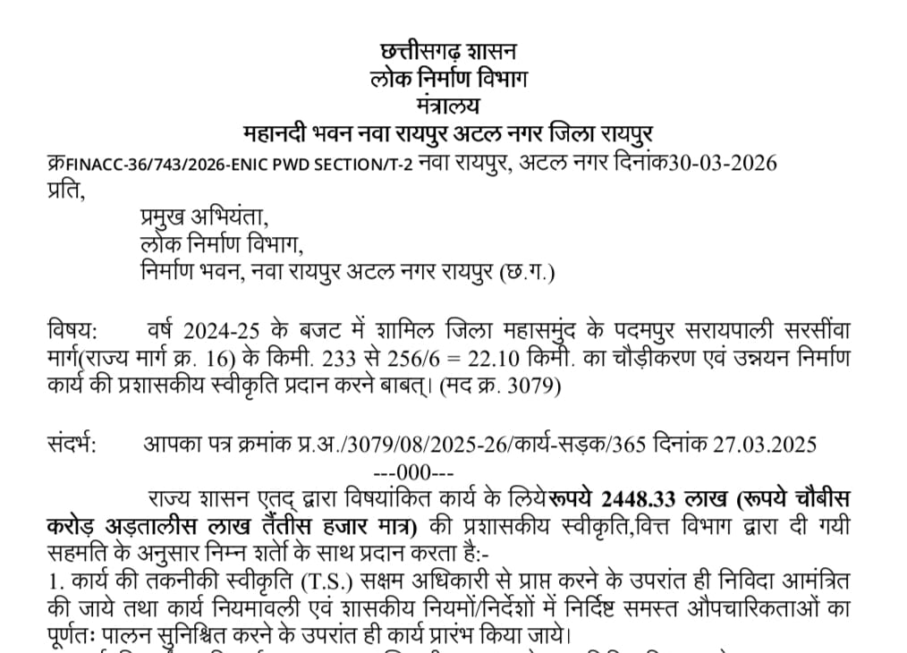 इस संदर्भ में लोक निर्माण विभाग मंत्रालय द्वारा प्रमुख अभियंता को पत्र क्रमांक फाइनेंस /36/743/2026/ENIK PWD SECTION/T 2dinank 30/3/2026 को जारी आदेश पत्र में कहा गया है कि विगत 2024-2025 के बजट में शामिल पदमपुर सरायपाली सरसीवां (राज्य मार्ग क्रमांक 16 ) के 233 से 256 /6 तक कुल 20.10 किलोमीटर मार्ग के चौड़ीकरण व उन्नायीकरण सड़क निर्माण हेतु 2448.33 लाख रुपए की राशि को स्वीकृति प्रदान करता है । ज्ञातव हो कि स्थानीय लोक निर्माण विभाग द्वारा एक वर्ष पूर्व ही 22 किलोमीटर सड़क निर्माण हेतु प्रस्ताव भेजा गया था । लोक निर्माण विभाग मंत्रालय द्वारा इस मार्ग के निर्माण हेतु प्रशासकीय स्वीकृति प्राप्त होने के बाद अब आम जनता में यह भ्रम की स्थिति उत्पन्न हो गई है कि आखिर यह साढ़े 24 करोड़ रुपए के निर्माण कार्यों की स्वीकृति किसके मांग व अनुशंसा पर की गई ? दोनों राजनैतिक दलों के नेता अपने अपने दावे पर अडिग हैं व सोशल मीडिया में श्रेय लेने के दावे ट्रोल हो रहे हैं ।