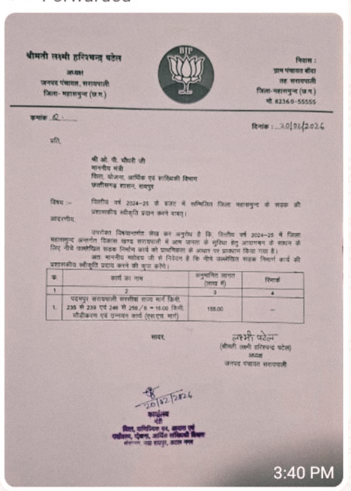 जनहित व आक्रोश को देखते हुवे इसे शीघ्र स्वीकृति प्रदान किए जाने की मांग पर यह स्वीकृति प्रदान की गई ।इसी तरह का एक पत्र महासमुंद जिला पंचायत अध्यक्ष श्रीमती लक्ष्मी हरिश्चन्द्र पटेल द्वारा भी वित्त मंत्री ओपी चौधरी को पत्र क्रमांक 0 दिनांक 20/2/2026 को प्रेषित किया गया था । वहीं महासमुंद सांसद रूपकुमारी चौधरी द्वारा वित्त मंत्री ओपी चौधरी को पत्र क्रमांक MP/ MSD/ 368/2025-2026 दिनांक 14/1/26 को पत्र लिखकर बजट में शामिल उक्त मार्ग को प्रशासकीय स्वीकृति प्रदान किए जाने की मांग की गई थी ।