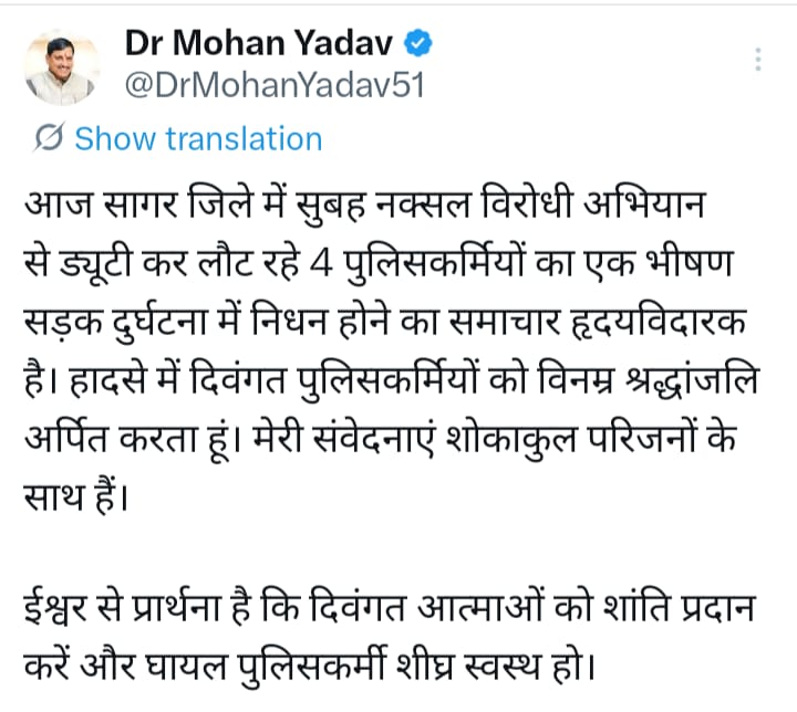 मुख्यमंत्री डॉ मोहन यादव ने जवानों को श्रद्धांजलि देते हुए अपने सोशल मीडिया अकाउंट एक्स (X) पर पोस्ट कर लिखा- आज सागर जिले में सुबह नक्सल विरोधी अभियान से ड्यूटी कर लौट रहे 4 पुलिसकर्मियों का एक भीषण सड़क दुर्घटना में निधन होने का समाचार हृदयविदारक है। हादसे में दिवंगत पुलिसकर्मियों को विनम्र श्रद्धांजलि अर्पित करता हूं। मेरी संवेदनाएं शोकाकुल परिजनों के साथ हैं। ईश्वर से प्रार्थना है कि दिवंगत आत्माओं को शांति प्रदान करें और घायल पुलिसकर्मी शीघ्र स्वस्थ हो।