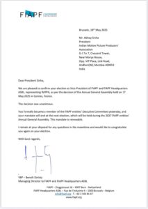 78 वें कान फिल्म समारोह में दुनिया भर के फिल्म निर्माताओं की सबसे बड़ी संस्था इंटरनेशनल फेडरेशन ऑफ फिल्म प्रोड्यूसर एसोसिएशन की वार्षिक आम सभा में इंपा प्रमुख अभय सिन्हा को आम सहमति से उपाध्यक्ष चुना गया। यह संस्था दुनिया के तीस देशों के फिल्म निर्माताओं का प्रतिनिधित्व करती है। अभय सिन्हा को इस संस्था के ब्रुसेल्स ( बेल्जियम) स्थित मुख्यालय ए एस बी एल का भी उपाध्यक्ष चुना गया है। एफआईएपीए ने एक विज्ञप्ति में इसकी जानकारी दी।
