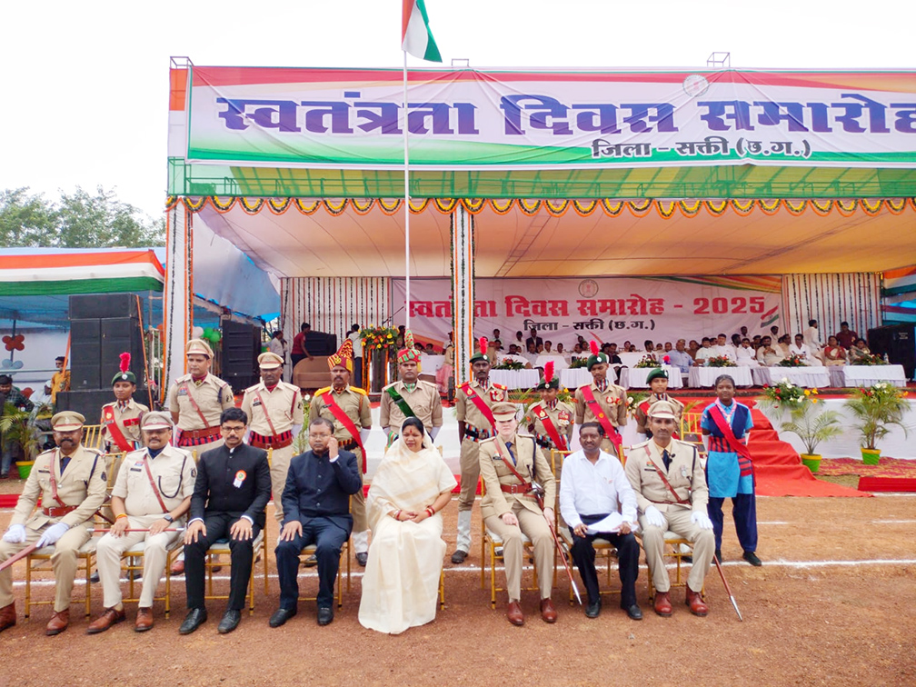 सक्ती। जिला मुख्यालय सक्ती में देश का उन्यासीवा (79वें ) स्वतंत्रता दिवस समारोह देशभक्ति की भावना और हर्षाेल्लास के साथ मनाया गया। स्वतंत्रता दिवस का मुख्य समारोह कलेक्टर कार्यालय के निकट मैदान में गरिमामय और भव्य रूप से आयोजित किया गया। जिसमें मुख्य अतिथि सांसद लोकसभा क्षेत्र जांजगीर - चांपा श्रीमती कमलेश जांगड़े ने ध्वजारोहण कर परेड की सलामी ली और मुख्यमंत्री का जनता के नाम प्रेषित स्वतंत्रता दिवस संदेश का वाचन किया। स्वतंत्रता दिवस मुख्य समारोह में स्कूली बच्चों द्वारा राष्ट्रीयता और देशभक्ति से ओत-प्रोत शानदार सामूहिक सांस्कृतिक कार्यक्रम की मनमोहक प्रस्तुति दी गई। इसके साथ ही इस अवसर पर उत्कृष्ट कार्य करने वाले अधिकारियों-कर्मचारियों को मुख्य अतिथि द्वारा प्रशस्ति पत्र देकर सम्मानित किया गया। साथ ही समाज सेवा के क्षेत्र में उत्कृष्ट योगदान देने के लिए उच्च न्यायालय अधिवक्ता श्री चितरंजय पटेल को विशेष रूप से प्रशस्ति पत्र देकर सम्मानित किया गया। स्वतंत्रता दिवस समारोह के जिला स्तरीय कार्यक्रम में पूर्व मंत्री श्री मेघाराम साहू, पूर्व विधायक डा. खिलावन साहू, सांसद प्रतिनिधि श्री संजय रामचंद्र जिला पंचायत उपाध्यक्ष श्री कमल पटेल,, जिला पंचायत सदस्य श्री आयुष शर्मा, जनपद अध्यक्ष मालखरौदा श्री कवि वर्मा, श्री रामनरेश यादव, सुश्री अन्नपूर्णा राठौर, श्री रमेश सिंघानिया सहित अन्य विभिन्न जनप्रतिनिधि, प्रथम जिला न्यायाधीश सक्ती श्री प्रशांत कुमार शिवहरे, विशेष न्यायाधीश, श्रीमती गंगा पटेल, मुख्य न्यायिक दंडाधिकारी सुश्री शुभद्रा गोयल, सिविल जज श्रीमती दिव्या गोयल, कलेक्टर श्री अमृत विकास तोपनो, पुलिस अधिक्षक सुश्री अंकिता शर्मा, जिला पंचायत सीईओ श्री वासु जैन, अपर कलेक्टर श्री बीरेंद्र लकड़ा, अपर कलेक्टर श्री के एस पैकरा, अतिरिक्त पुलिस अधिक्षक श्री हरिश यादव, एसडीएम सक्ती श्री अरूण सोम, जिला प्रशासन और पुलिस प्रशासन के विभिन्न अधिकारी कर्मचारी, गणमान्य नागरिक, और बड़ी संख्या में स्कूली छात्र-छात्राए एवं जिलेवासी उपस्थित थे।