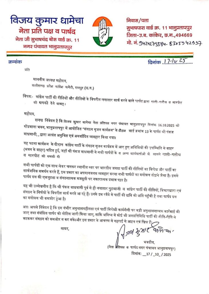 जानकारी के अनुसार, नेता प्रतिपक्ष एवं पार्षद विजय कुमार धामेचा ने छत्तीसगढ़ प्रदेश कांग्रेस कमेटी के अध्यक्ष को पत्र लिखकर बताया कि दिनांक 16 अक्टूबर को आयोजित कार्यक्रम के दौरान वार्ड क्रमांक 13 के पार्षद पंकज वाधवानी ने भवन के बाहर सभी पार्षदों और कार्यकर्ताओं के समक्ष अत्यंत अनुचित एवं अमर्यादित व्यवहार किया। उन्होंने गाली-गलौच करते हुए मारपीट की धमकी दी, जिससे उपस्थित सभी कार्यकर्ता आहत हुए।
