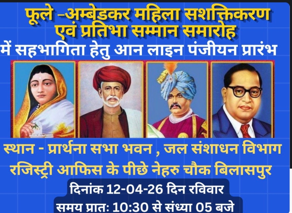 बिलासपुर। भारत रत्न बाबा साहब भीम राव अम्बेडकर एवं महामना ज्योतिबा फुले जी की जयंती के पावन अवसर पर दिनांक 12:04:26 रविवार को फूले -अम्बेडकर महिला सशक्तिकरण एवं प्रतिभा सम्मान समारोह का आयोजन किया जा रहा है जिसमें महिलाओं एवं बच्चों को विशेष रूप से सम्मानित किया जायगा I जिसका उद्देश्य है फूले – अम्बेडकर विचारधारा से पुरुषों एवं बच्चों को अधिक से अधिक संख्या में जोड़ना है।