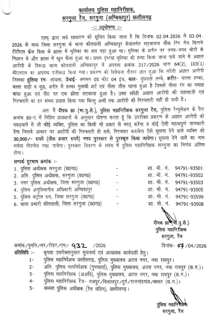 महिला के सिर की 3 हड्डियां जबकि 12 पसलियां टूटी हुई थीं। दरिंदगी और हत्या से शहर के लोगों में आक्रोश है। कांग्रेस पिछले 3 दिन से हत्यारे की गिरफ्तारी को लेकर प्रदर्शन कर रही है। विरोध को देखते हुए सरगुजा रेंज के आईजी दीपक झा ने 30 हजार रुपए व डीआईजी राजेश अग्रवाल ने 5 हजार रुपए आरोपी पर इनाम की घोषणा की है।