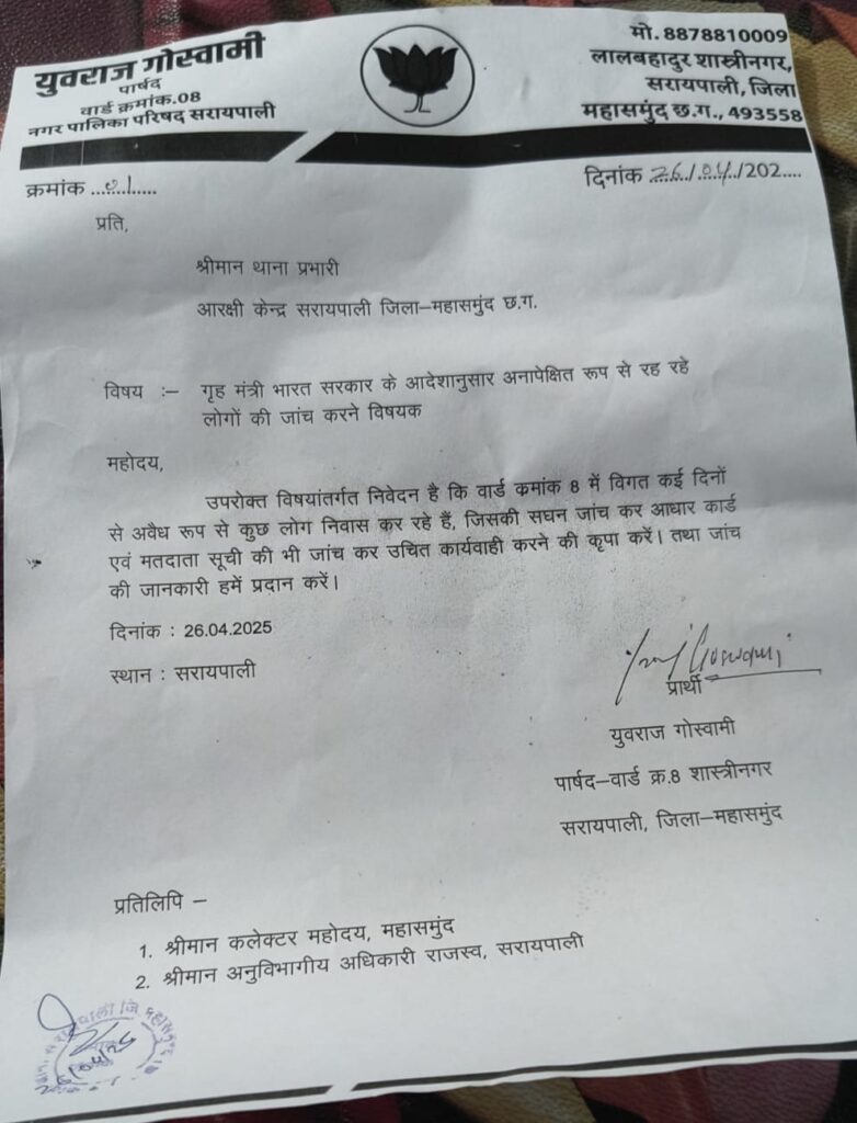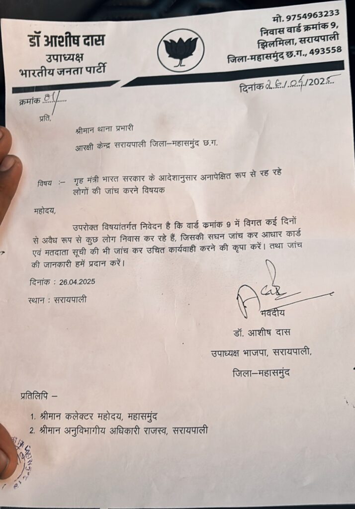 इस संबंध में नगर के दो भाजपा के पदाधिकारी क्रमशः युवराज गिरी ( पार्षद ) तथा डॉ आशीष दास ( उपाध्यक्ष ) द्वारा विगत 3/5/2025 को लगभग एक वर्ष पूर्व थाना प्रभारी को ज्ञापन सौंपते हुवे कहा गया था कि पहलगाम में आतंकवादियों द्वारा निर्ममता पूर्वक 27 टूरिस्टों की धर्म पूछकर हत्या किए जाने से पूरे देश मे इसके खिलाफ आक्रोश व्याप्त है। देश में अब अवैध रूप से रहने वाले रोहिंग्या मुसलमानों, घुसपैठियों व बांग्लादेशियो की पहचान कर उन्हें देश से बाहर भेज जा रहा है। साथ ही अवैध रूप से रहने वाले अप्रवासियों की जांच व पहचान किये जाने का कार्य देश भर में युद्धगति से किया जा रहा है। इसी के तहत सरायपाली नगर व ग्रामीण क्षेत्रो में ऐसे लोगों की पहचान की जांच किये जाने की मांग विभिन्न सामाजिक संगठनों, हिन्दू संगठनों व राजनीति से जुड़े लोगों द्वारा स्थानीय प्रशासन को ज्ञापन सौंपकर अन्य प्रांतों से आये लोगों की पहचान व जांच किये जाने की मांग की गई थी। ज्ञातव्य हो की पहलगांव में घटित घटना के पूर्व से ही बाहरी वी अप्रवासी बांग्लादेशियों व रोहिंग्या के संबंध में “आज की जनधारा “