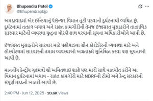 गुजरात के अहमदाबाद में हुए भयावह विमान हादसे के बाद रेस्क्यू अभियान जारी है. वही गुजरात के सीएम भूपेंद्र पटेल ने विमान दुर्घटनाग्रस्त होने की घटना पर दुख जताया है. उन्होंने एक्स पर पोस्ट कर कहा, ‘अहमदाबाद में एयर इंडिया के यात्री विमान के दुर्घटनाग्रस्त होने की घटना से मुझे गहरा दुख हुआ है. मैंने अधिकारियों को तत्काल बचाव और राहत कार्य चलाने और घायल यात्रियों के तत्काल उपचार की व्यवस्था युद्ध स्तर पर करने के निर्देश दिए हैं. मैंने घायल यात्रियों को इलाज के लिए ले जाने के लिए ग्रीन कॉरिडोर की व्यवस्था करने और अस्पताल में इलाज की सभी व्यवस्थाएं प्राथमिकता के आधार पर सुनिश्चित करने के भी निर्देश दिए हैं. केंद्रीय गृह मंत्री अमित शाह ने भी मुझसे बात की है और पूर्ण सहयोग का आश्वासन दिया है.’