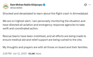 नागरिक उड्डन मंत्री राममोहन नायडू विमान दुर्घटनाग्रस्त होने की खबर मिलते ही तुरंत विजयवाड़ा से अहमदाबाद पहुंच गए हैं. वे डीजीसीए, एनडीआरएफ और गुजरात राज्य प्रशासन के वरिष्ठ अधिकारियों के साथ लगातार संपर्क में हैं, ताकि त्वरित, समन्वित प्रतिक्रिया और सहायता सुनिश्चित की जा सके. बचाव और चिकित्सा दल मौके पर हैं.
