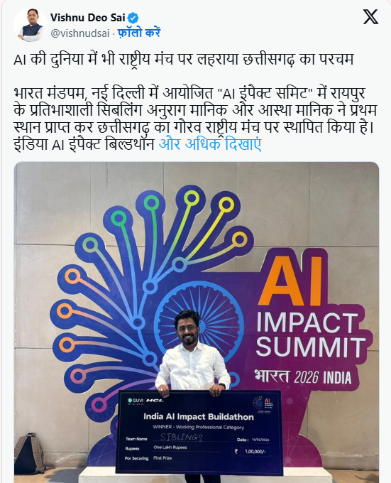 मुख्यमंत्री विष्णुदेव साय ने कहा कि AI Impact Summit में छत्तीसगढ़ का स्टॉल अंतरराष्ट्रीय स्तर पर आकर्षण का केंद्र बनना प्रदेश के लिए गर्व का विषय है। उन्होंने कहा कि नवा रायपुर में स्थापित किया जा रहा AI डाटा सेंटर पार्क डिजिटल नवाचार और उच्च तकनीकी निवेश को नई गति देगा।