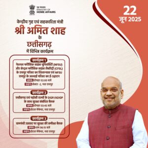 केंद्रीय गृहमंत्री अमित शाह आज (22 जून) से दो दिवसीय छत्तीसगढ़ दौरे पर रहेगें. उनके कार्यक्रम में एनएफएसयू परिसर का शिलान्यास, सुरक्षा बैठकें और अबूझमाड़ के ग्रामीणों के साथ संवाद शामिल है.