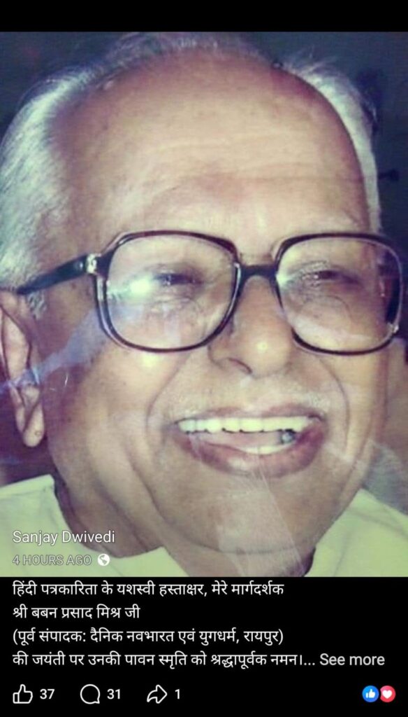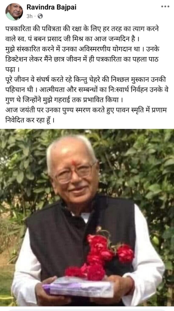 आज स्वर्गीय श्री बबन प्रसाद मिश्र जी की जयंती पर उनका पुण्य स्मरण करते हुए यह कहना अनुचित नहीं होगा कि वे केवल एक व्यक्ति नहीं थे, बल्कि पत्रकारिता की वह आत्मा थे, जो सत्य के साथ खड़ी रहती है, चाहे समय कितना ही कठिन क्यों न हो। उनकी स्मृति, उनकी सोच और उनके मूल्य आने वाली पीढ़ियों के लिए सदैव प्रकाशपुंज बने रहेंगे।उनकी पावन स्मृति को श्रद्धापूर्वक नमन।