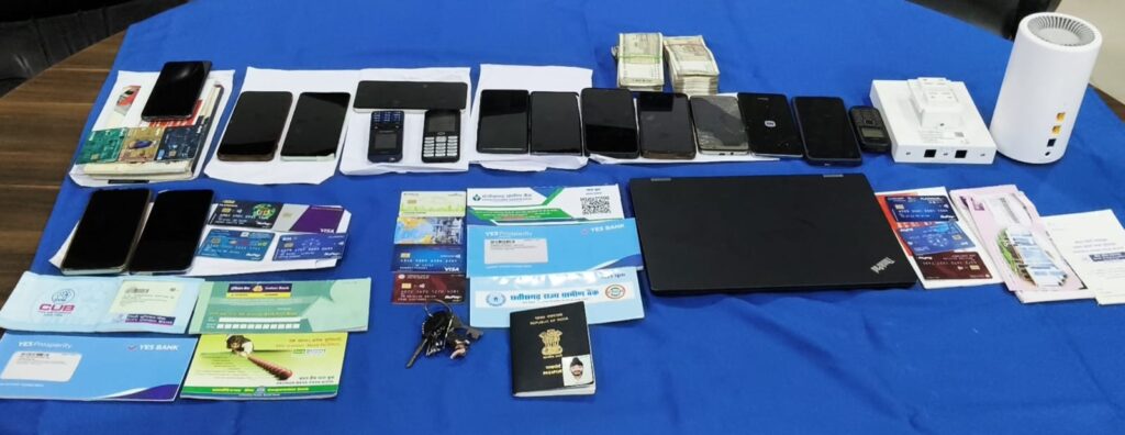 पुलिस ने आरोपियों के कब्जे से ₹1,00,000 नगद, 16 मोबाइल फोन, 1 लैपटॉप, 7 बैंक पासबुक, 15 एटीएम कार्ड, वाई-फाई उपकरण, लेन-देन से संबंधित रजिस्टर और एक पासपोर्ट जप्त किया है।