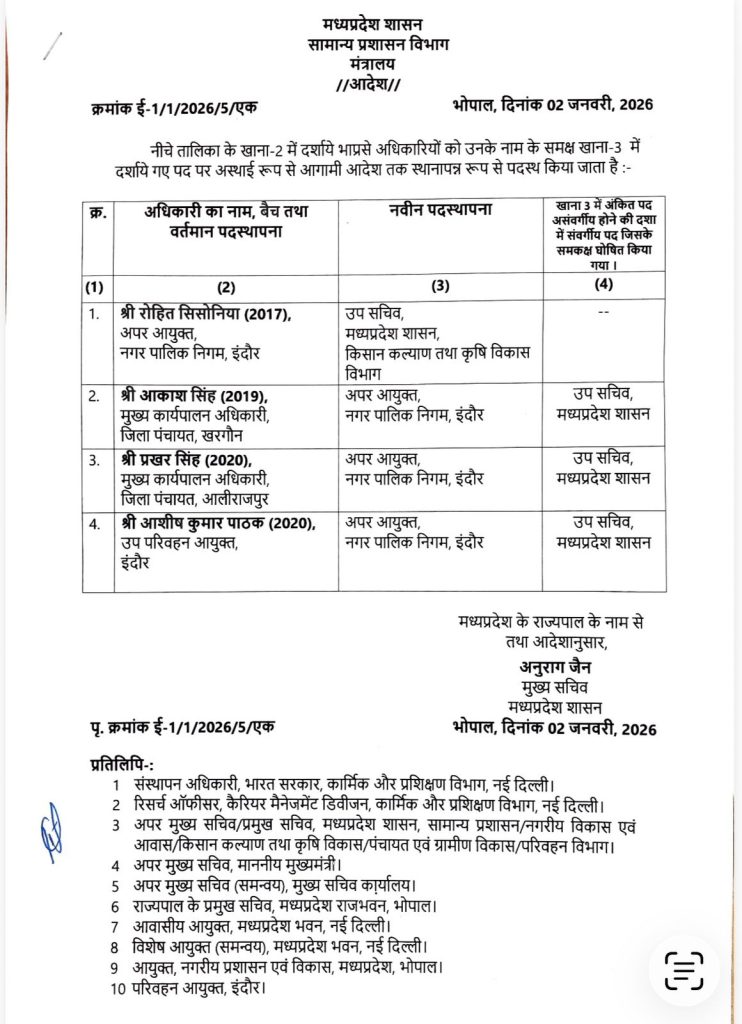 - आशीष कुमार पाठक, उप परिवहन आयुक्त, इंदौर को नगर निगम में अपर आयुक्त की अतिरिक्त जिम्मेदारी दी गई है।