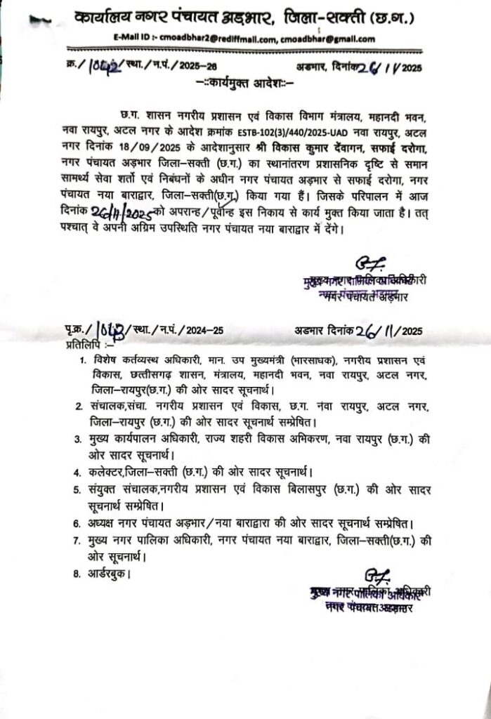 जिसका जीता जागता उदाहरण यह है कि नगरीय प्रशासन मंत्री के द्वारा नगर पंचायत अडभार के सफाई दरोगा एवं इंजीनियर का तबादला का आदेश हुए दो से ढाई माह हो गये है जिसमें से सफाई दरोगा को नगर पंचायत अडभार से रिलीफ कर दिया गया है. मगर इंजीनियर को अब तक रोक रखा गया है. ये सब मुख्य नगर पालिका अधिकारी के संरक्षण में हो रहा है.