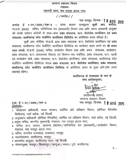 रायपुर। राज्य शासन ने आईएएस अधिकारी आर. संगीता (2005 बैच) को बड़ी जिम्मेदारी सौंपी है। वह वर्तमान में सचिव, वाणिज्यिक कर (आबकारी) विभाग और आबकारी आयुक्त (अति प्रभार) के पद पर कार्यरत हैं। अब उन्हें प्रबंध संचालक, छत्तीसगढ़ बेवरेजेस कॉर्पोरेशन और प्रबंध संचालक, छत्तीसगढ़ स्टेट मार्केटिंग कॉर्पोरेशन लिमिटेड का भी अतिरिक्त प्रभार दिया गया है।
