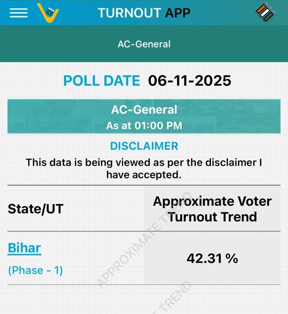 बिहार विधानसभा चुनाव के पहले चरण की वोटिंग जारी है। दोपहर 1 बजे तक 42.31 प्रतिशत