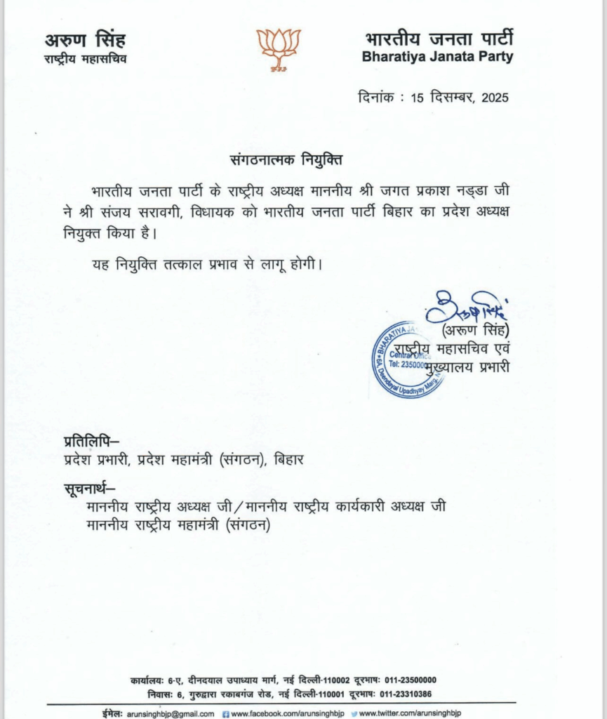 बिहार। भारतीय जनता पार्टी ने बिहार प्रदेश अध्यक्ष के पद पर संजय सरावगी की नियुक्ति की है। केंद्रीय नेतृत्व के इस फैसले के बाद राज्य संगठन में नई रणनीति और टीम गठन को लेकर राजनीतिक सरगर्मी तेज हो गई है। दरभंगा शहरी से विधायक संजय सरावगी को यह अहम जिम्मेदारी सौंपी गई है।