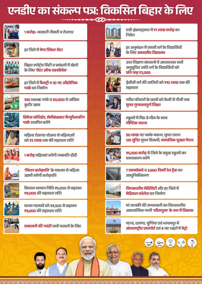 एनडीए का दावा है कि यह संकल्प पत्र केवल वादों का नहीं, बल्कि “विकसित बिहार” के लिए कार्य योजना है
