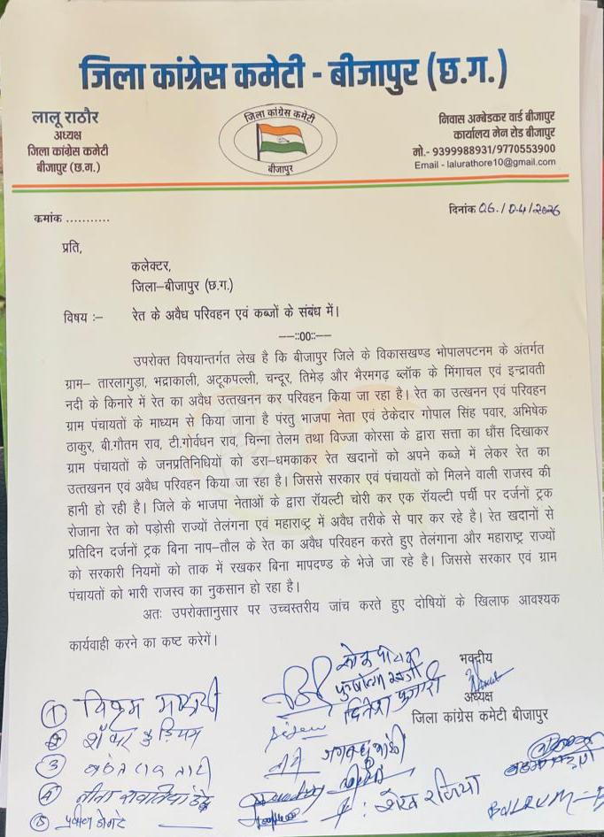 उन्होंने चेतावनी दी कि यदि सरकार और प्रशासन रेत के अवैध उत्खनन और परिवहन पर तुरंत संज्ञान नहीं लेता, तो कांग्रेस पार्टी जनता के साथ मिलकर जिले में उग्र आंदोलन करने को मजबूर होगी। इस पूरे मामले की जांच की मांग को लेकर जिला कांग्रेस कमेटी ने कलेक्टर बीजापुर को ज्ञापन सौंपा है।