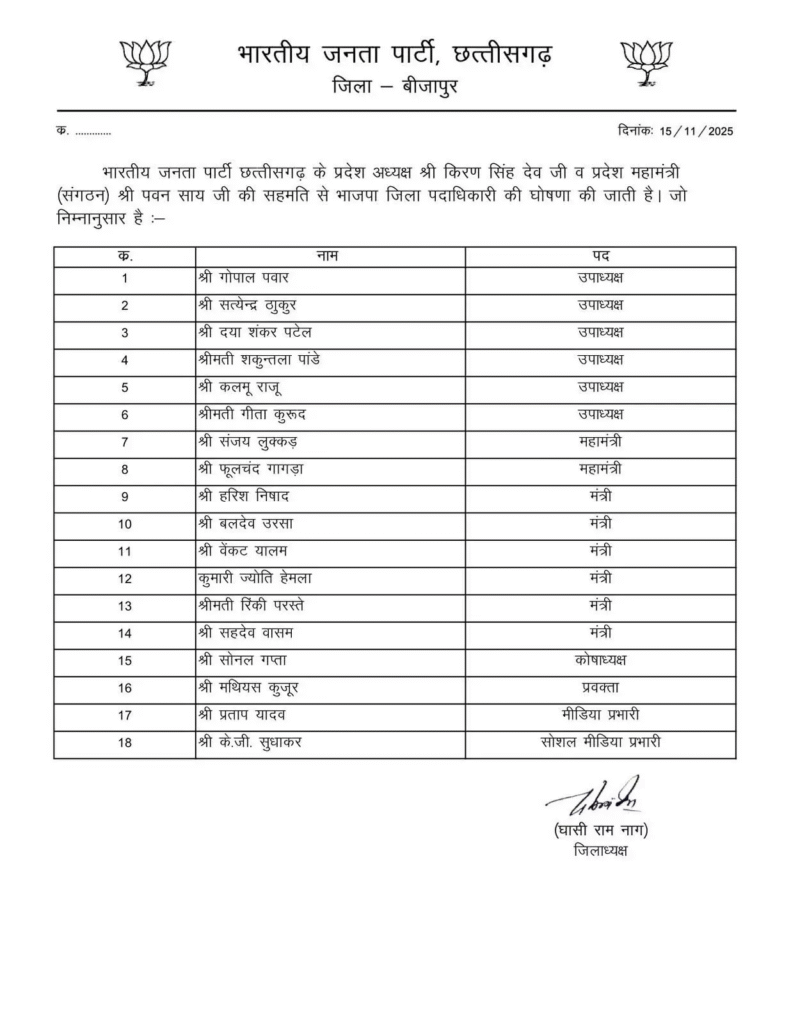 बीजापुर। भारतीय जनता पार्टी, छत्तीसगढ़ ने संगठनात्मक ढांचे को मजबूती देने के उद्देश्य से जिले के नए पदाधिकारियों की घोषणा की है। प्रदेश अध्यक्ष किरणदेव सिंह और प्रदेश महामंत्री (संगठन) पवन साय की सहमति से यह नियुक्ति सूची जारी की गई है।