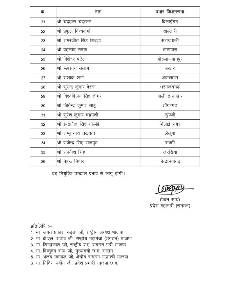 रायपुर। छत्तीसगढ़ में भारतीय जनता पार्टी ने संगठनात्मक ढांचे को सुदृढ़ करने के तहत 36 विधानसभा प्रभारियों की नियुक्ति की है। यह आदेश भाजपा प्रदेश अध्यक्ष किरण सिंह देव द्वारा जारी किया गया है।