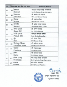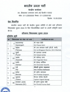 बीजेपी की इस नई सूची में सोनीपत की राई सीट से कृष्णा गहलावत, गुरुग्राम की पटौदी (रिजर्व) सीट से बिमला चौधरी, रेवाड़ी की बावल सीट से कृष्ण कुमार, फरीदाबाद की बड़खल सीट से धनेश अदलक्खा, लाडवा से सीएम नायब सैनी, नारायणगढ़ सीट से पवन सैनी, और कुरुक्षेत्र की पिहोवा सीट से जय भगवान शर्मा को टिकट दिया गया है।