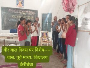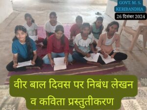 शासन द्वारा चिह्नित वीर बाल दिवस के उद्देश्य स्पष्ट करते हुए प्रधानपाठक नरेन्द्र वैष्णव ने बच्चों की छुपी प्रतिभाओं को उकरित करने निबंध लेखन व कविता , कहानी प्रस्तुतीकरण का आयोजन किया । निबंध लेखन में विद्यालय की बालिकाओं ने अकल्पनीय सहभागिता निभाते हुए कार्यक्रम को सफल बनाया । निबंध लेखन में संजना सिदार, आकांक्षा सिदार, मधु पटेल, नम्रता पटेल, रवीना गोंड़,कात्यायनी शर्मा, दीक्षा बरेठ, सानिया पटेल,तानिया नेताम,साक्षी सिदार व नीतू पटेल ने भाग लेते हुए एकता , दयालुता तथा साहसिकता का परिचय दिया ।