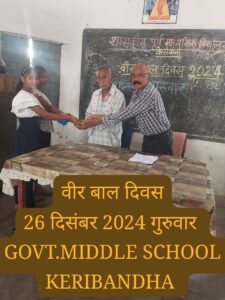 विगत दिवस 26 दिसंबर 2024 को विकासखंड सक्ती अंतर्गत अवस्थित शासकीय पूर्व माध्यमिक विद्यालय केरीबंधा में वीर बाल दिवस कार्यक्रम का आयोजन संपन्न हुआ । कार्यक्रम के मुख्य अतिथि गुलाराम पटेल एवं प्रधानपाठक नरेन्द्र कुमार वैष्णव ने उप शाला नायक भावना बरेठ के साथ दीप प्रज्वलित कर माँ शारदे का पूजन करते हुए कार्यक्रम का शुभारंभ किया । सानिया,तानिया , साक्षी ने सरस्वती वंदना प्रस्तुत किया ।