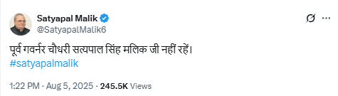 सत्यपाल मलिक के निधन से राजनीतिक हलकों में शोक की लहर है। उनके परिवार और समर्थकों के प्रति संवेदनाएं व्यक्त की गई हैं।