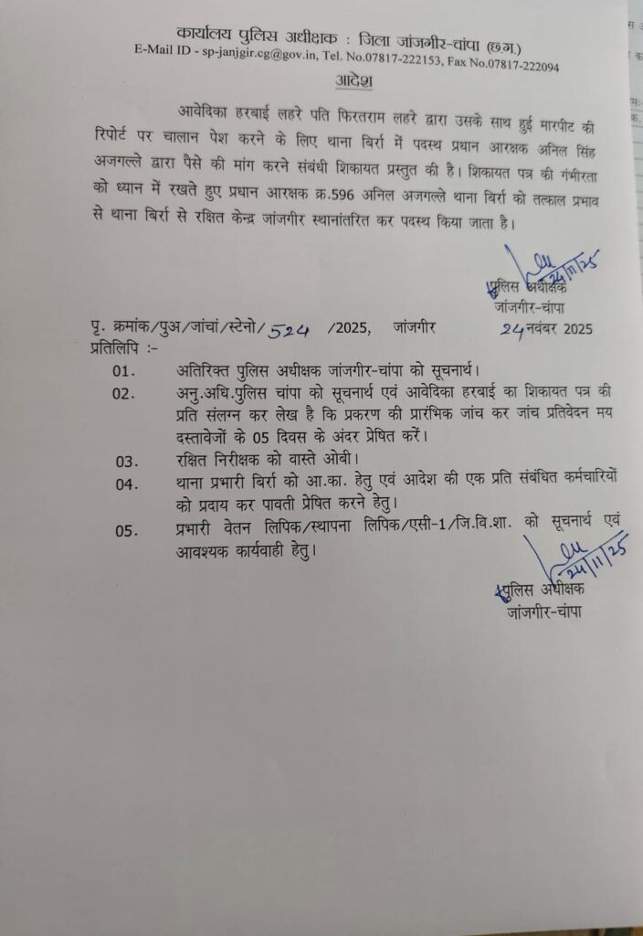 जांजगीर-चांपा: चालान पेश करने के नाम पर रिश्वत की मांग करने वाले आरक्षक पर पुलिस अधीक्षक ने बड़ी कार्रवाई की है। थाना बिर्रा में पदस्थ प्रधान आरक्षक अनिल सिंह अजगल्ले को एक महिला पीड़िता से चालान पेश करने के नाम पर पैसे मांगने के आरोप में लाइन हाजिर कर दिया गया है।