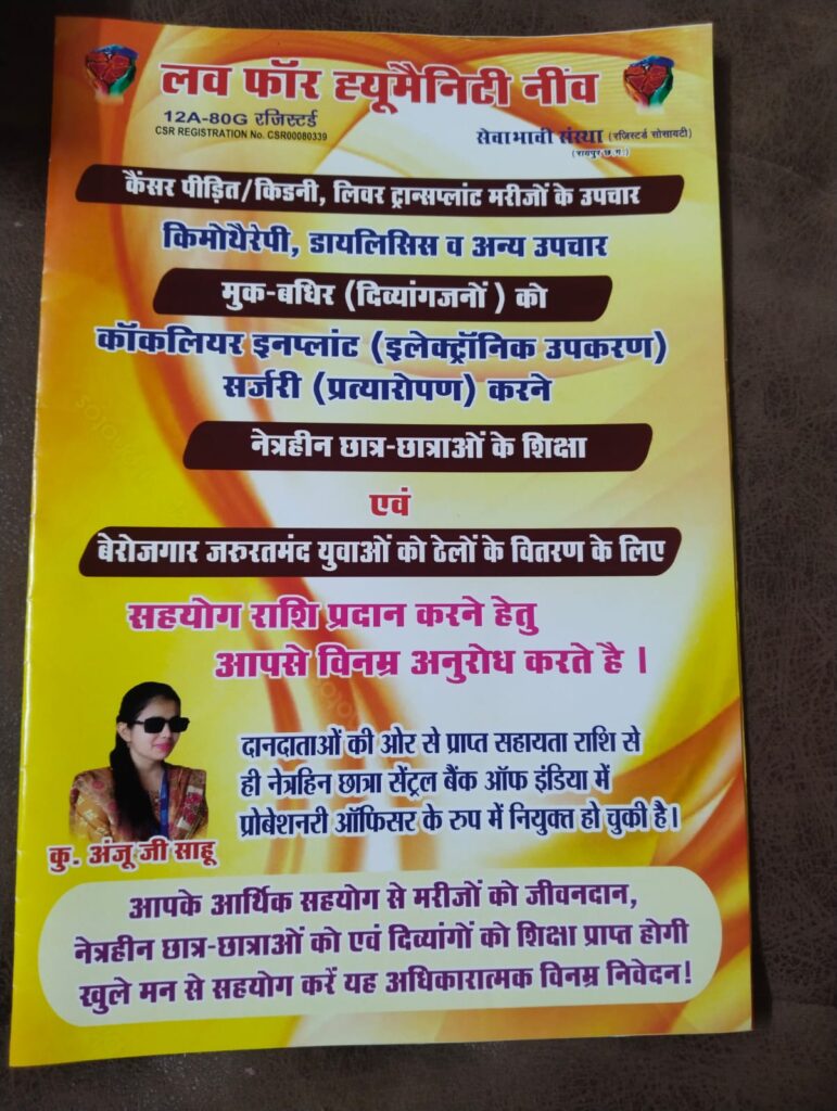 बता दें कि लव फॉर ह्यूमैनिटी नींव संस्था जरूरत मंदों के मदद के लिए हमेशा आगे रही है। सहयोग राशि हेतु इस ब्रोशर का विमोचन कैंसर पीड़ित, किडनी और लिवर ट्रान्सप्लांट मरीजों को उपचार के लिए दी जाएगी। साथ ही नेत्रहीन बालिकाओं के की शिक्षा के लिए खर्च की जाएगी।