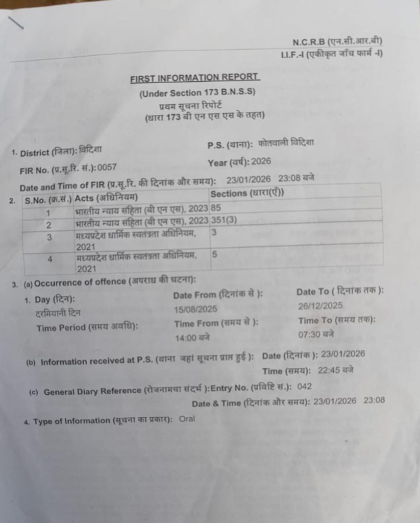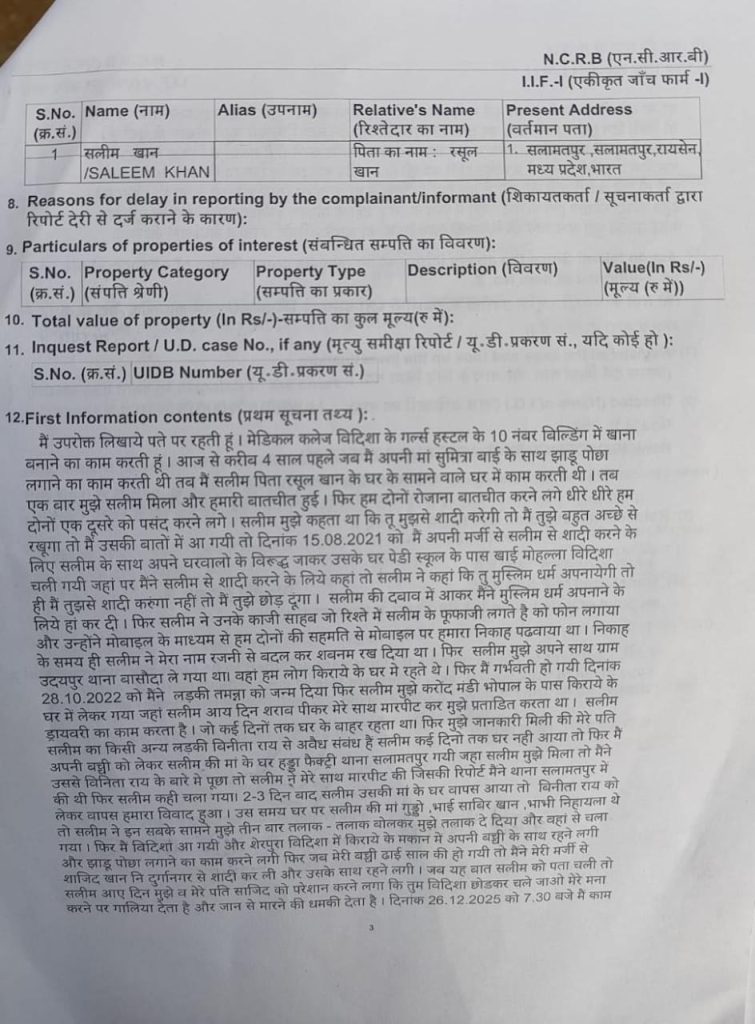 मध्यप्रदेश के विदिशा जिले से कथित लव जिहाद और जबरन धर्म परिवर्तन का एक और मामला सामने आया है। पीड़िता की शिकायत पर पुलिस ने मामला दर्ज कर जांच शुरू कर दी है। आरोप है कि सलीम खान नामक युवक ने पहचान छुपाकर एक हिंदू युवती से नजदीकियां बढ़ाईं, शादी की और बाद में उस पर धर्म परिवर्तन का दबाव बनाया।