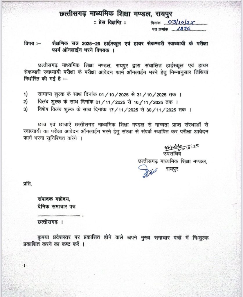 रायपुर। छत्तीसगढ़ माध्यमिक शिक्षा मंडल (CGBSE) ने शैक्षणिक सत्र 2025-26 के लिए हाईस्कूल और हायर सेकेंडरी बोर्ड परीक्षा के फॉर्म भरने की समय-सारणी जारी कर दी है। यह सुविधा स्वाध्यायी और नियमित दोनों प्रकार के विद्यार्थियों के लिए होगी। आवेदन की पूरी प्रक्रिया ऑनलाइन की जाएगी।