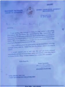 मैं आपसे अनुरोध करता हूं कि आप इस पर गौर करें और उन्हें तुरंत रिहा करवाएं और ओडिशा सीमा पर जाने के दौरान उनकी सुरक्षा सुनिश्चित करें। हिरासत में लिए गए लोगों में से कई महिला पीआरआई सदस्य हैं।