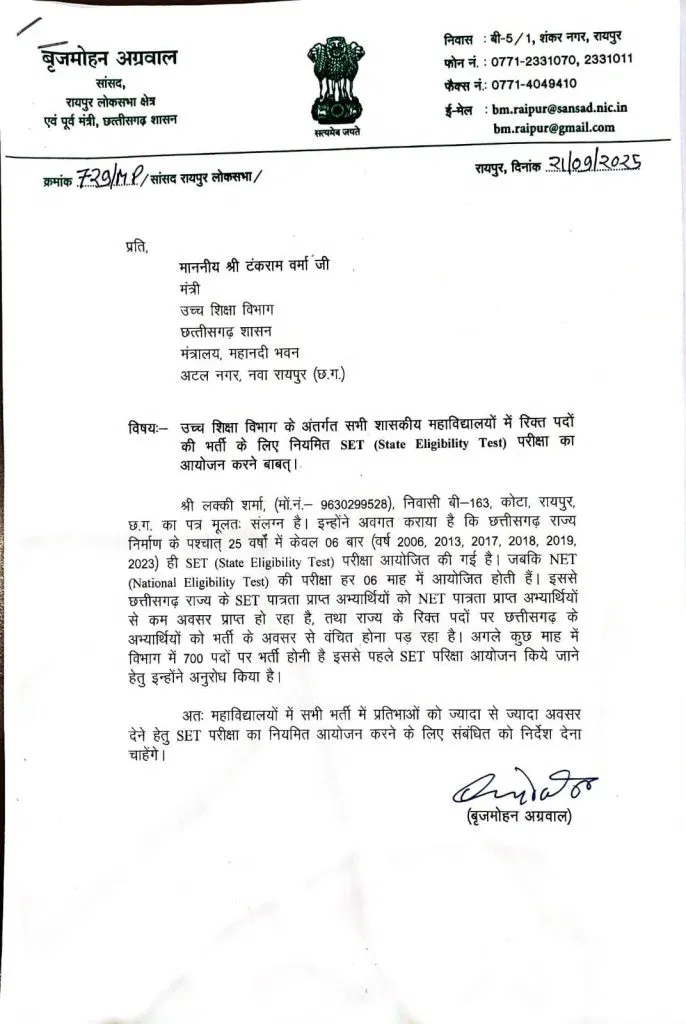 CG News : सांसद बृजमोहन अग्रवाल का उच्च शिक्षा मंत्री को पत्र,नियमित रूप से SET परीक्षा कराने की उठाई मांग