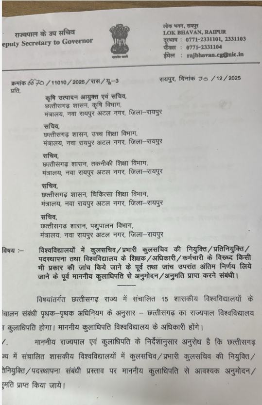 छत्तीसगढ़ के शासकीय विश्वविद्यालयों में कार्यरत अधिकारियों, शिक्षकों और कर्मचारियों के खिलाफ अब किसी भी प्रकार की जांच शुरू करने से पहले राज्यपाल की अनुमति लेना अनिवार्य कर दिया गया है। यही नहीं, जांच पूरी होने के बाद लिए जाने वाले अंतिम निर्णय के लिए भी कुलाधिपति की स्वीकृति आवश्यक होगी। इस संबंध में लोकभवन से आधिकारिक आदेश जारी कर दिया गया है।