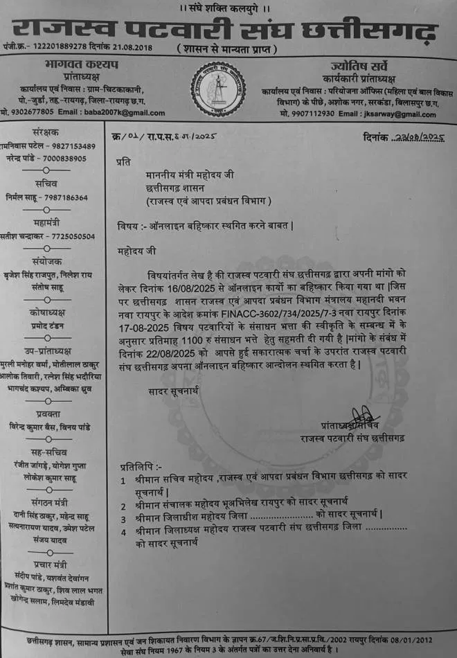 रायपुर। छत्तीसगढ़ में अपनी मांगों को लेकर पिछले कई दिनों से ऑनलाइन कार्यों का बहिष्कार कर रहे पटवारियों ने अंततः अपना आंदोलन स्थगित कर दिया है। यह निर्णय राजस्व मंत्री टंकराम वर्मा से हुई सकारात्मक चर्चा के बाद लिया गया।