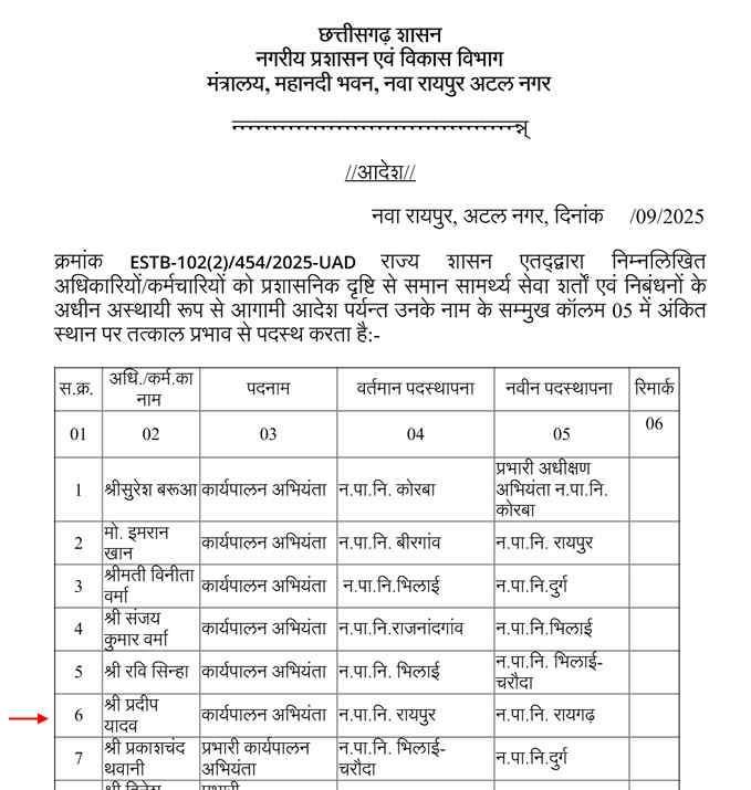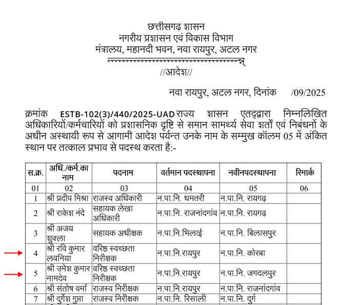 सूत्रों के अनुसार, ट्रांसफर सूची में शामिल अधिकारियों में रवि लावण्य (ज़ोन स्वास्थ्य अधिकारी) को कोरबा नगर निगम, संतोष वर्मा (राजस्व उपनिरीक्षक) को राजनांदगांव, रोशन देव रात्रे (उप अभियंता) को जगदलपुर नगर निगम, उमेश नामदेव (ज़ोन स्वास्थ्य अधिकारी) और प्रदीप यादव (कार्यपालन अभियंता मैकेनिकल) को रायगढ़ नगर निगम में ट्रांसफर किया गया था।
