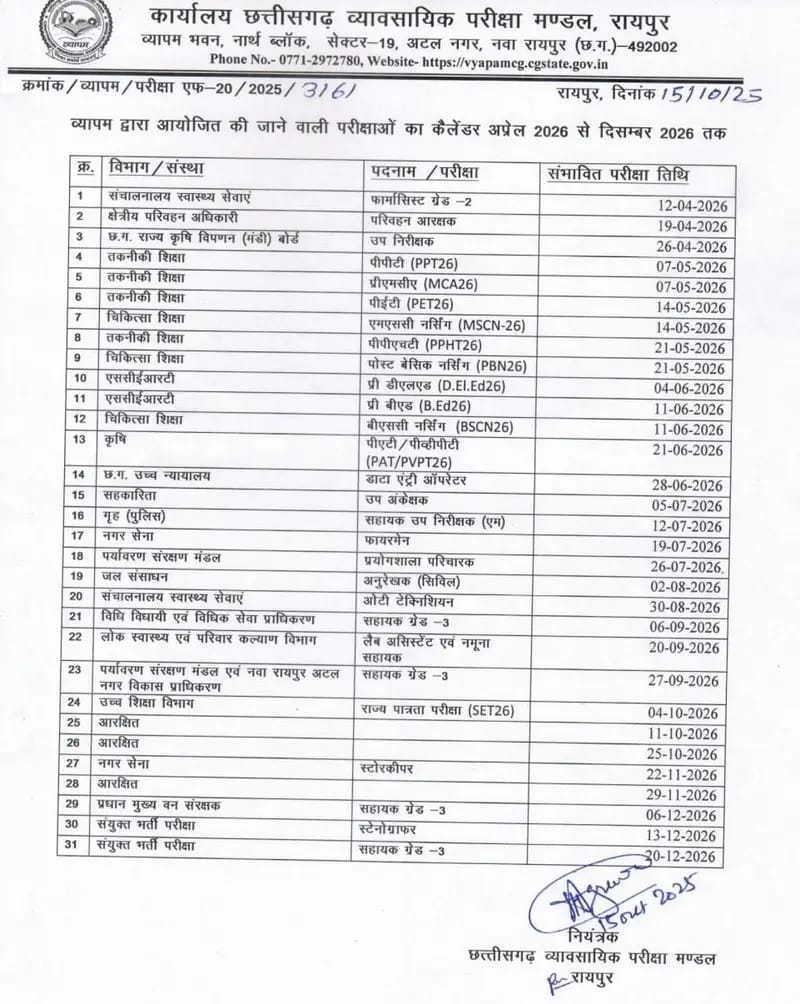 रायपुर। छत्तीसगढ़ व्यावसायिक परीक्षा मंडल (व्यापम) ने वर्ष 2026 के लिए प्रवेश और भर्ती परीक्षाओं का वार्षिक कैलेंडर जारी कर दिया है। जारी शेड्यूल के अनुसार अप्रैल से दिसंबर तक 25 से अधिक परीक्षाएं आयोजित की जाएंगी। सबसे पहली परीक्षा 12 अप्रैल को फार्मासिस्ट ग्रेड-2 भर्ती के लिए होगी।