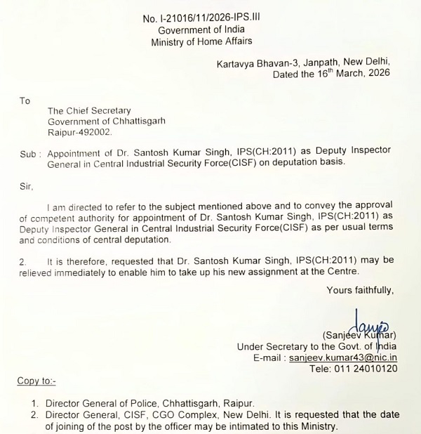 संतोष सिंह वर्तमान में पुलिस मुख्यालय रायपुर में डीआईजी, सीसीटीएनएस (CCTNS) और एससीआरबी (SCRB) के पद पर पदस्थ हैं। केंद्रीय प्रतिनियुक्ति के आदेश जारी होने के बाद अब वे जल्द ही अपने नए दायित्व को संभालेंगे। राज्य शासन द्वारा इस संबंध में आगामी औपचारिक प्रक्रिया पूरी की जा रही है।