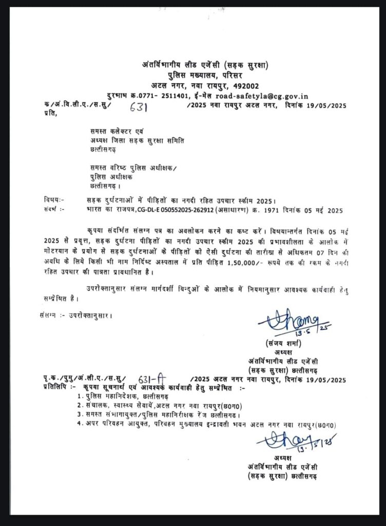 सड़क सुरक्षा समिति के अध्यक्ष संजय शर्मा ने आदेश जारी कर सभी अस्पतालों और जिला कलेक्टरों को निर्देशित किया है कि इस फैसले का सख्ती से पालन सुनिश्चित किया जाए। साथ ही, पुलिस व प्रशासन को यह भी निर्देश दिया गया है कि दुर्घटना की स्थिति में तुरंत पीड़ित को अस्पताल पहुंचाया जाए और योजना का लाभ दिलाया जाए।