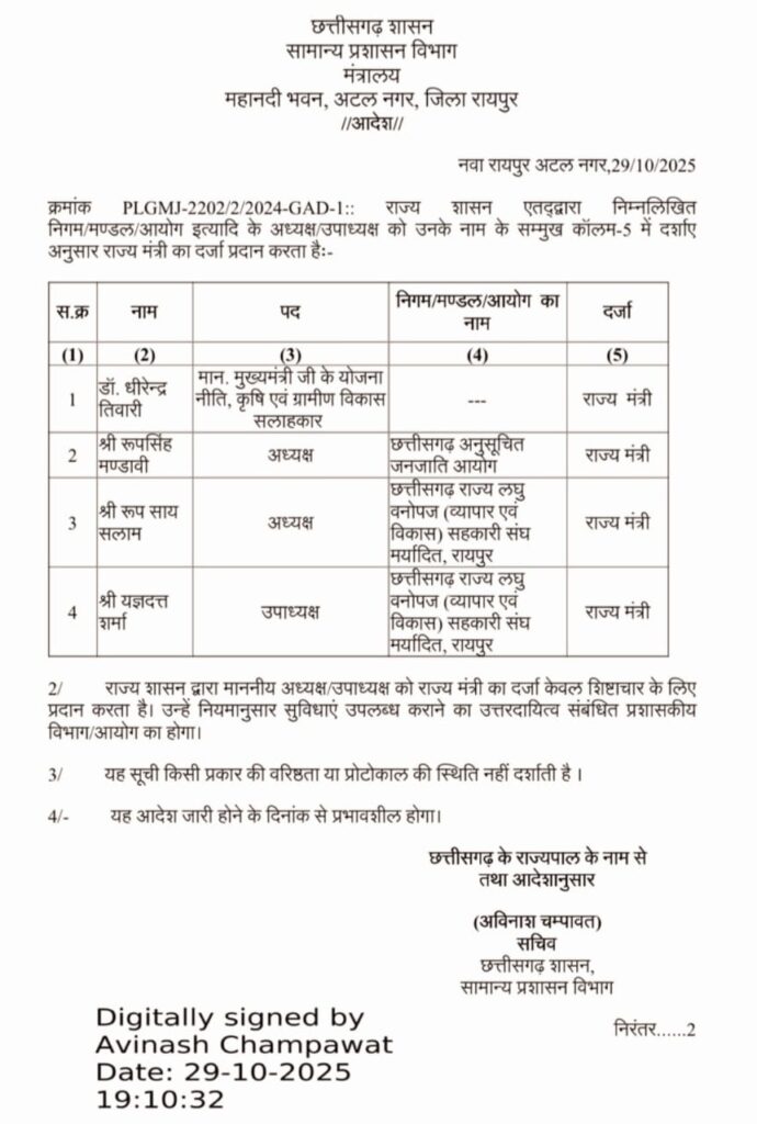 ग्रामीण विकास सलाहकार डॉ. धीरेंद्र तिवारी को राज्यमंत्री का दर्जा दिया गया है।