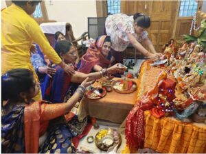 बगिया निवास में आयोजित इस पूजन में राधा-कृष्ण की मूर्तियों को विशेष रूप से सजाया गया। श्रीमती कौशल्या साय ने वैदिक मंत्रोच्चार और विधि-विधान के साथ पूजा की शुरुआत की। पूजन के दौरान भगवान राधा-कृष्ण को फूल, मिष्ठान, और वस्त्र अर्पित किए गए, जिसके बाद झूलन उत्सव का आयोजन हुआ। इस उत्सव के दौरान राधा-कृष्ण की मूर्तियों को श्रद्धा और प्रेमपूर्वक झूला झुलाया गया।