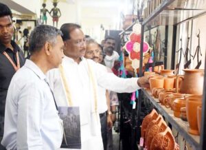 रायपुर। मुख्यमंत्री विष्णु देव साय ने आज शिल्पनगरी कोण्डागांव के आगमन पर शबरी एंपोरियम का भ्रमण किया। इस दौरान उन्होंने बेलमेटल, रॉट आयरन, बांस एवं काष्ठ शिल्प के बस्तर की जीवन शैली और समृद्ध जनजातीय संस्कृतियों को दर्शाती कलाकृतियों को देखा और इसकी सराहना की। उन्होंने यहां शिल्पियों से मुलाकात कर बेलमेटल सहित विभिन्न कलाकृतियों की निर्माण प्रक्रिया और उनकी मार्केटिंग के संबंध में जानकारी ली। शिल्पकारों ने मुख्यमंत्री को बेलमेटल से बने कलाकृति भेंट की।