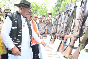 नारायणपुर। प्रदेश के मुख्यमंत्री श्री विष्णुदेव साय आज ओरछा ब्लॉक के ग्राम बासिंग स्थित बीएसएफ कैम्प पहुंचे, जहां पर उन्होंने 21 मई को हुई डीआरजी-बीएसएफ और जिला बल के द्वारा माओवादियों के विरूद्ध नारायणपुर, दंतेवाड़ा और बीजापुर की सरहदी पहाड़ियों में चलाए गए नक्सल विरोधी ऑपरेशन में 27 नक्सलियों को मार गिराने वाले जवानों की हौसला-अफजाई की। इस दौरान मुख्यमंत्री के साथ उप मुख्यमंत्री एवं गृहमंत्री श्री विजय शर्मा, वन एवं जल संसाधन मंत्री श्री केदार कश्यप विशेष रूप से उपस्थित रहे। मुख्यमंत्री ने बासिंग कैम्प में जवानों को संबोधित करते हुए कहा कि यह माओवाद के विरूद्ध अब तक की सबसे बड़ी कार्रवाई है जिसमें सुरक्षा बलों ने हार्डकोर माओवादी बसवा राजू सहित 27 को मार गिराया।